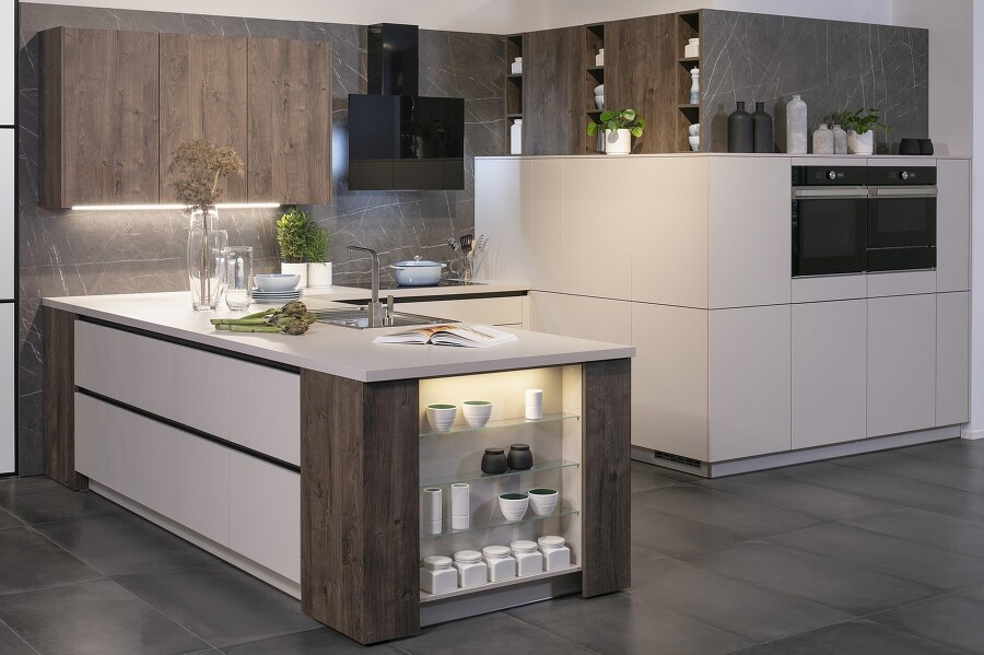 An der Spüle verbringt man in der Küche mit Abstand die meiste Zeit. Ist es da nicht viel schöner, währenddessen in den offenen Raum zu blicken als bloß gegen die Wand? – Aus diesem Grund haben wir diese Küche einmal anders geplant als derzeit üblich: Das Kochfeld ist wandbündig verbaut, und die Küchenspüle ist auf die freistehende Küchentheke gewandert.